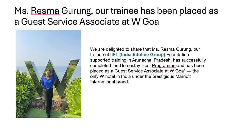 •From FY 2025-26, Ms Resma Gurung from batch 1 have been placed to W Goa, a five star property located in Goa. And Ms Nikita Pathak and Ms Ritu Sharma from batch 2 have been placed to Mahindra Emerald Palm, also a Five star property located in Goa.